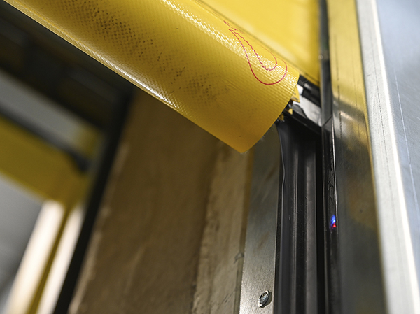 Als Schließkantenabsicherung ist ein selbstabschaltendes Lichtgitter im Einsatz, wodurch ein kontaktloses Reversieren gewährleistet ist. Der Torbehang ist zusätzlich mit einem flexiblen Bodenabschluss ausgestattet, der im Fall einer Kollision aus den Führungsschienen springt. Im Falle einer Kollision ist der Torflügel in der Lage sich eigenständig wieder in die Führungschienen einzufädeln.. Das ALIGA-Rapida Cooler funktioniert dann mit dem nächsten Öffnungsimpuls wieder einwandfrei.